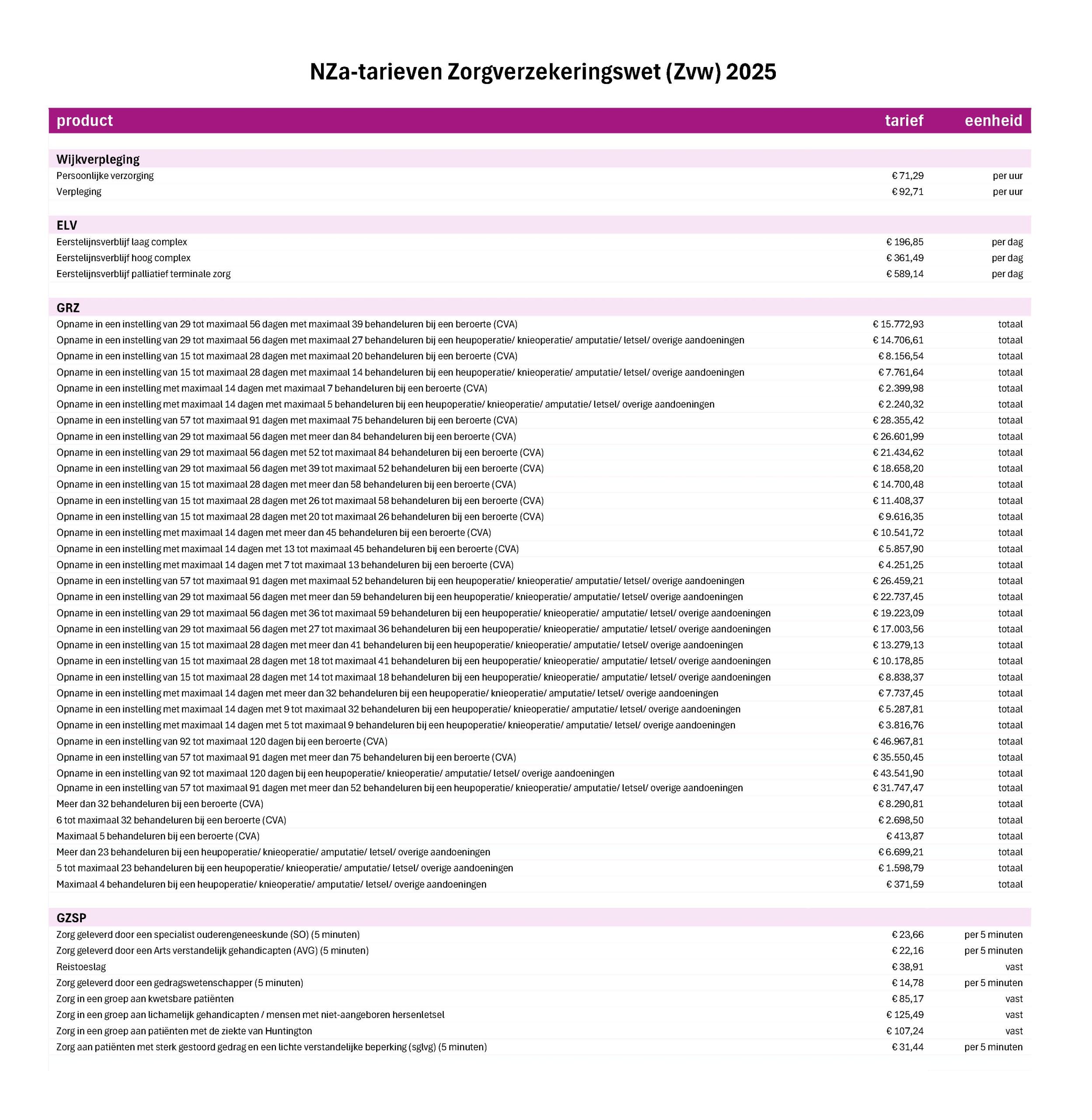 Als we voor de zorg die u van ons ontvangt geen contract hebben met uw zorgverzekeraar, noemen we dat ongecontracteerde zorg. In dat geval hanteren wij de tarieven zoals vastgesteld door de NZa (Nederlandse Zorgautoriteit). Hier vindt u een overzicht van de NZa-tarieven voor 2025.